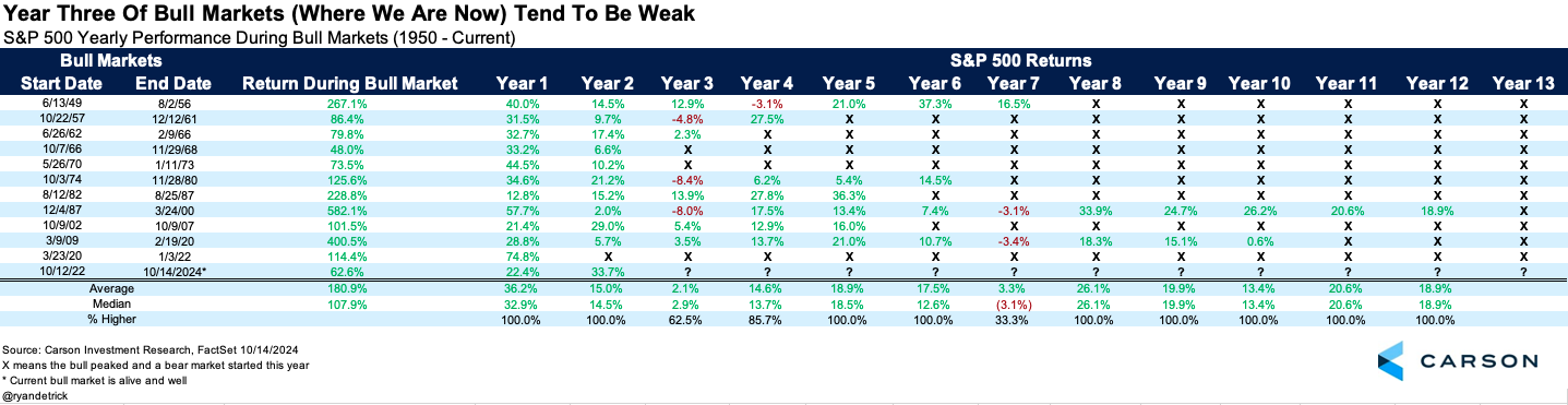 Here’s another look at things. This table took us a long time to put together, but we like the way it turned out and we think you can learn a lot from it. The biggest takeaway is year three of bull markets does tend to be rather weak, up only 2.1% on average. We guess this shouldn’t be a huge surprise, as usually years one and two tend to see huge gains, so some type of choppy action or consolidation the third year would be normal.